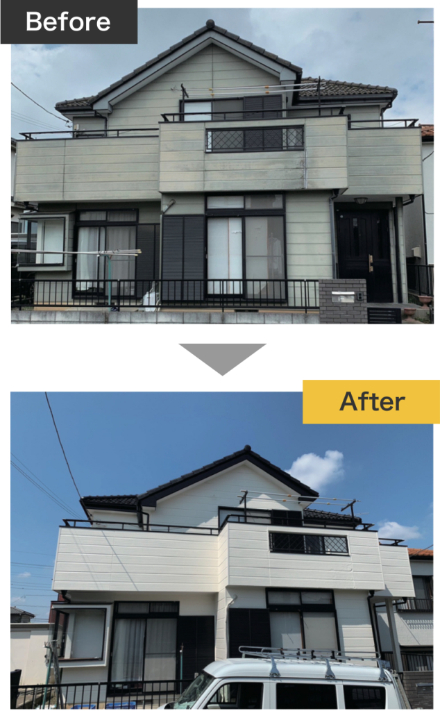 付帯部分のブラックをアクセントにすることで、メリハリのあるスタイリッシュな外観に仕上がっています。塗装による保護効果も向上し、見た目と耐久性の両方を改善することができました。