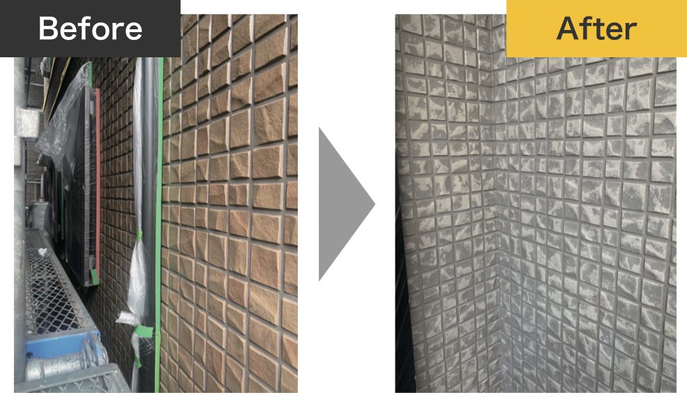 明るいグレートーンへカラー変更することで、洗練されたスタイリッシュな外観へと生まれ変わりました。タイル特有の立体感を活かしながら、光の当たり方によって表情が変わる上品な仕上がりとなり、建物全体が軽やかで現代的な印象になりました。